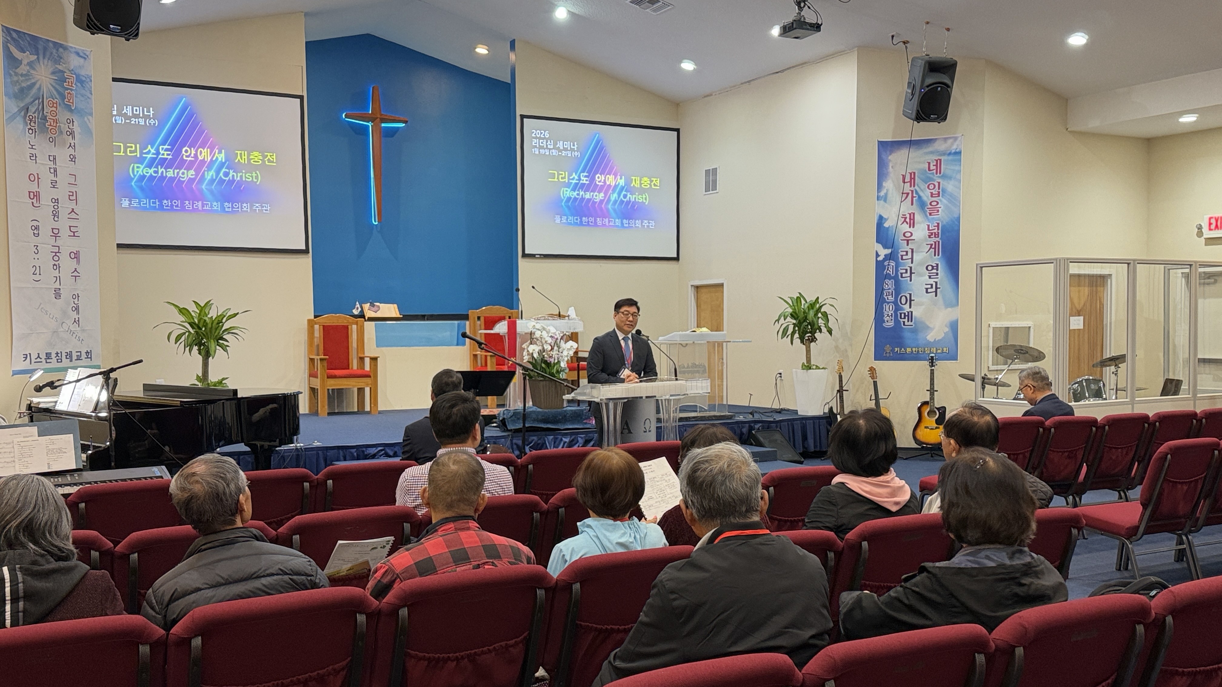 플로리다 한인침례교회 협의회는 지난 1월 19일(월)부터 20일(화)까지 이틀간, 템파 지역에 위치한 키스톤 한인침례교회(김은복 목사 시무)에서 2026 리더십 세미나를 개최했다. 이번 세미나는 그리스도 안에서 재충전(Recharge in Christ)’이라는 주제를 가지고 진행되었다. 참석자들은 분주한 사역의 현장 속에서 다시 주님 앞에 서서, 사역과 교회의 본질을 되짚는 시간을 가졌다.