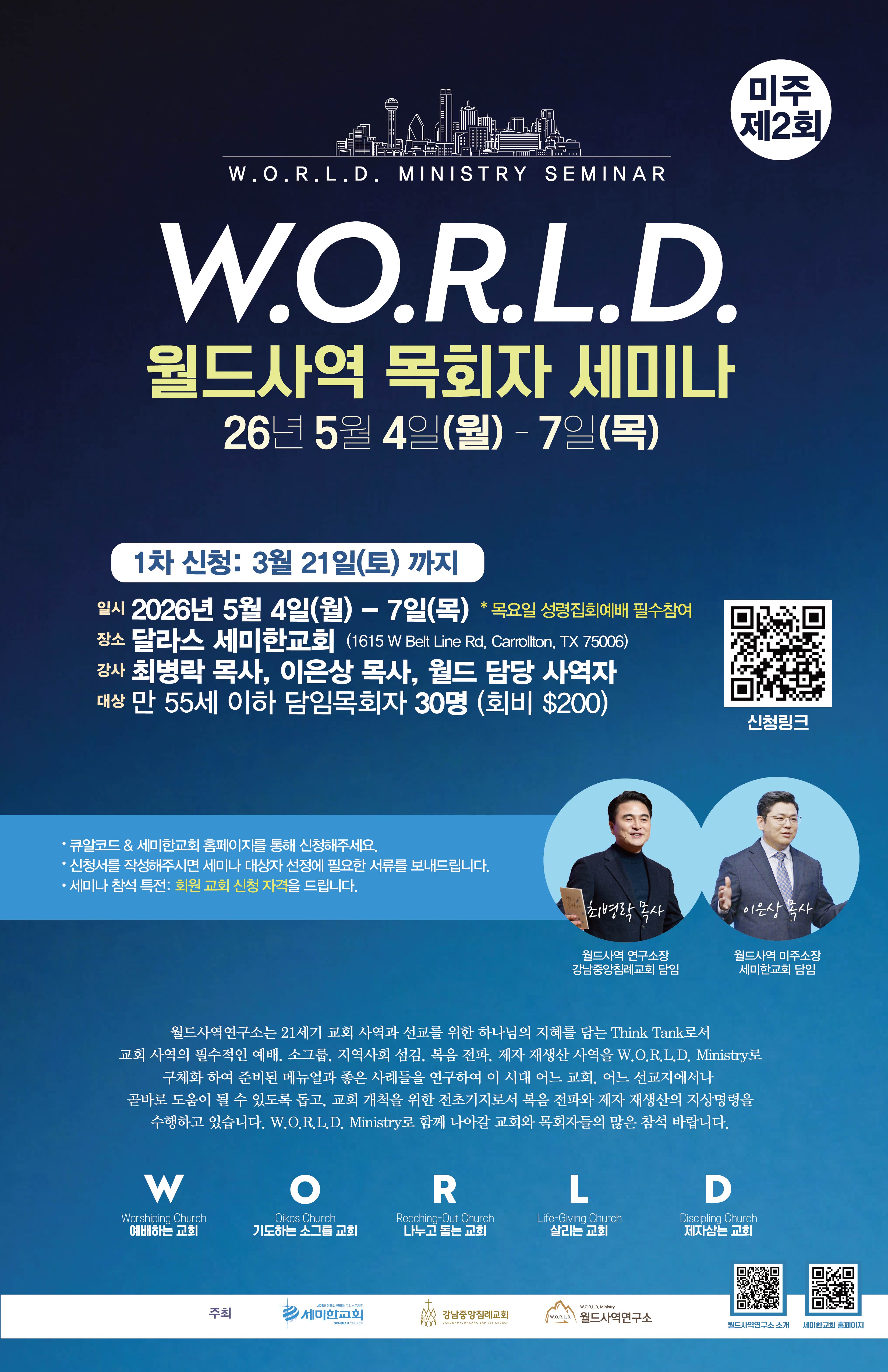 제2회 미주 W.O.R.L.D.사역 목회자세미나 신청하기  https://forms.gle/DSQh7ty8PSMmw6cY8