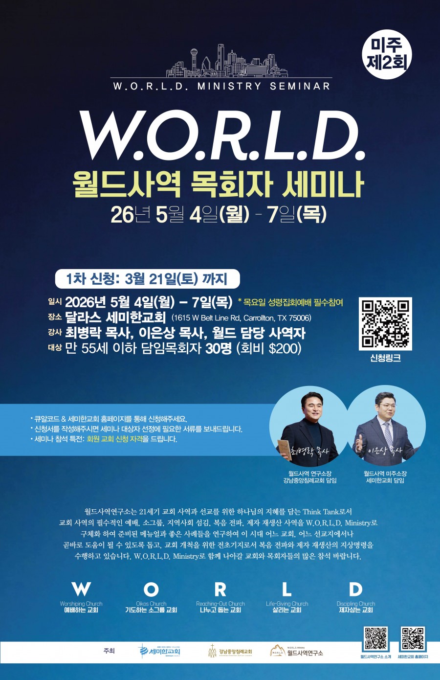 이번 세미나는 W.O.R.L.D. Ministry(Worshiping, Oikos, Reaching-Out, Life-Giving, Discipling)를 주제로 교회와 목회 사역의 본질을 다시 붙들고 나아갈 힘을 얻는 세미나가 될 것입니다. 특별히 하나님께서 세우신 목회자들을 위한 비전 제시와 실제적인 사역의 길을 함께 나누고자 합니다.
