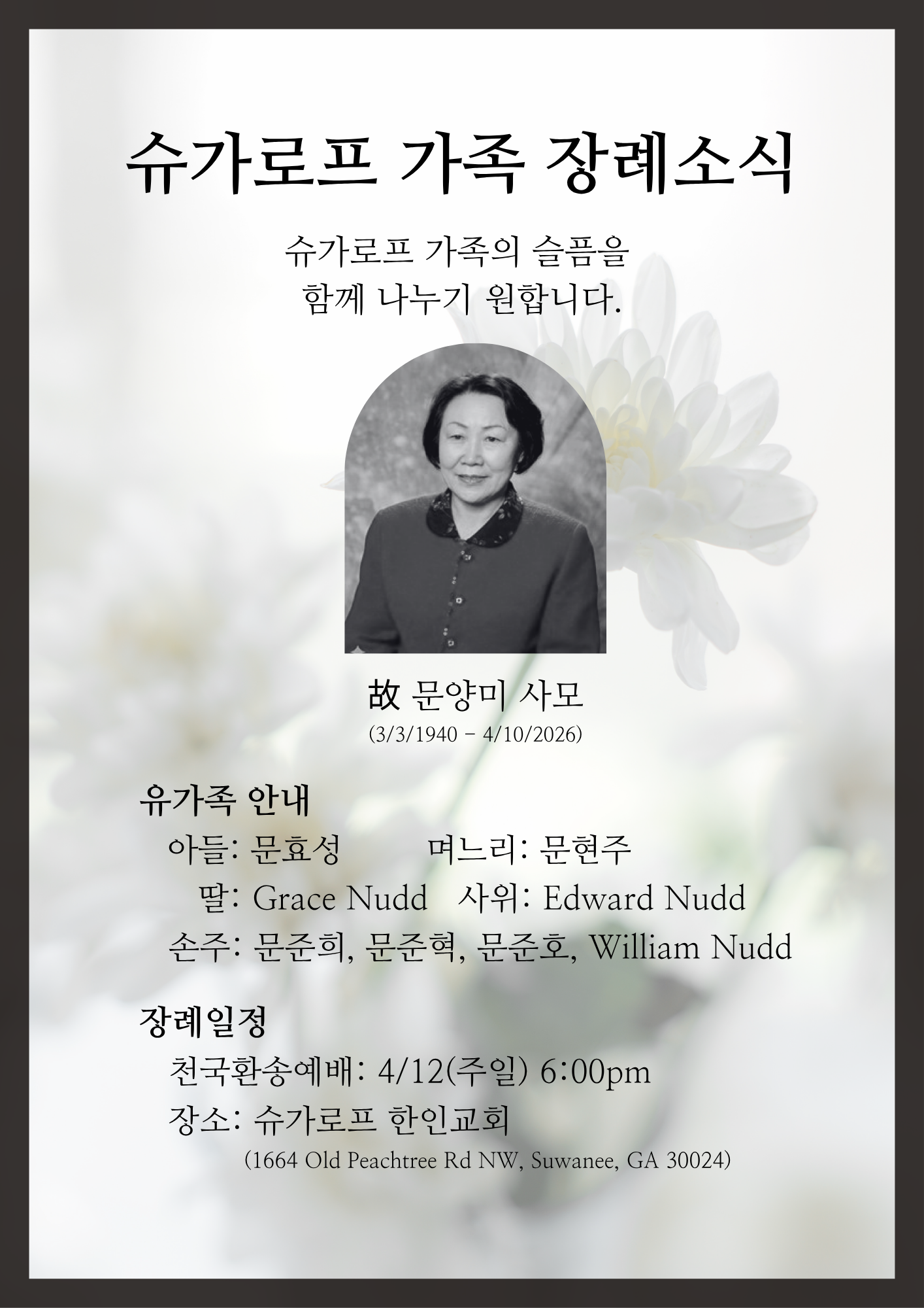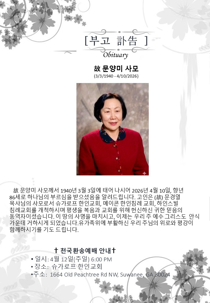 故 문양미 사모께서 1940년 3월 3일에 태어 나시어 2026년 4월 10일, 향년 86세로 하나님의 부르심을 받으셨음을 알려드립니다. 고인은 (故) 문경열 목사님의 사모로서 슈가로프 한인교회, 메이콘 한인침례 교회, 하인스빌침례교회를 개척하시며 평생을 복음과 교회를 위해 헌신하신 귀한 믿음의 동역자이셨습니다. 이 땅의 사명을 마치시고, 이제는 우리 주 예수 그리스도 안식 가운데 거하시게 되었습니다.유가족위에 부활하신 우리 주님의 위로와 평강이 함께하시기를 기도 드립니다.