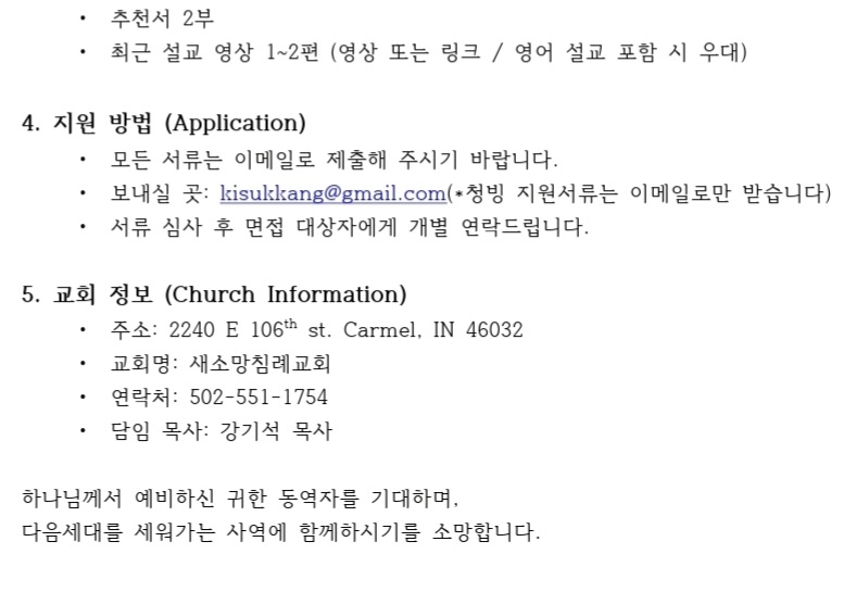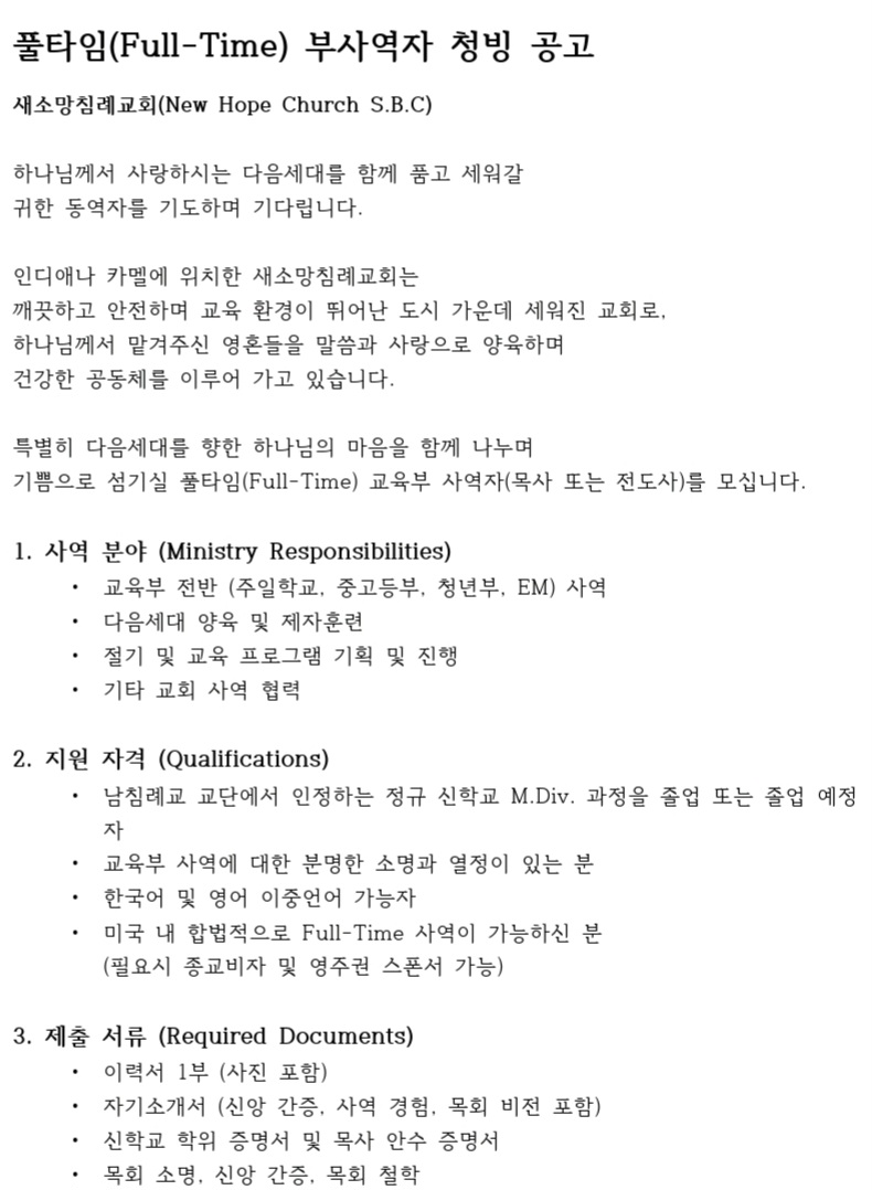새소망교회 풀타임 부사역자 청빙 공고