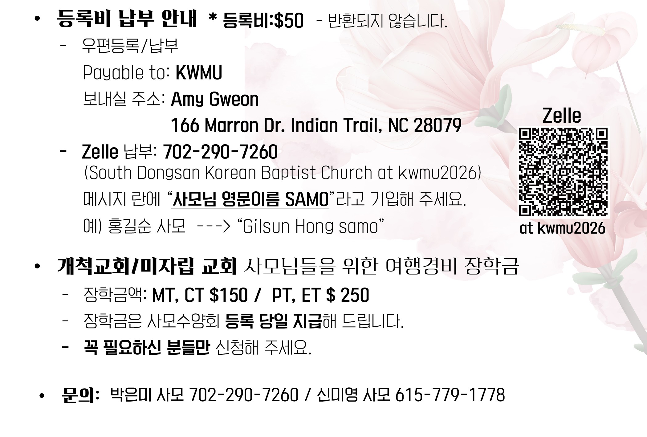 또한 등록비는 우편(수표)로 보내주셔도 되고 zelle로 납부하셔도 됩니다. (위의 내용 참고)