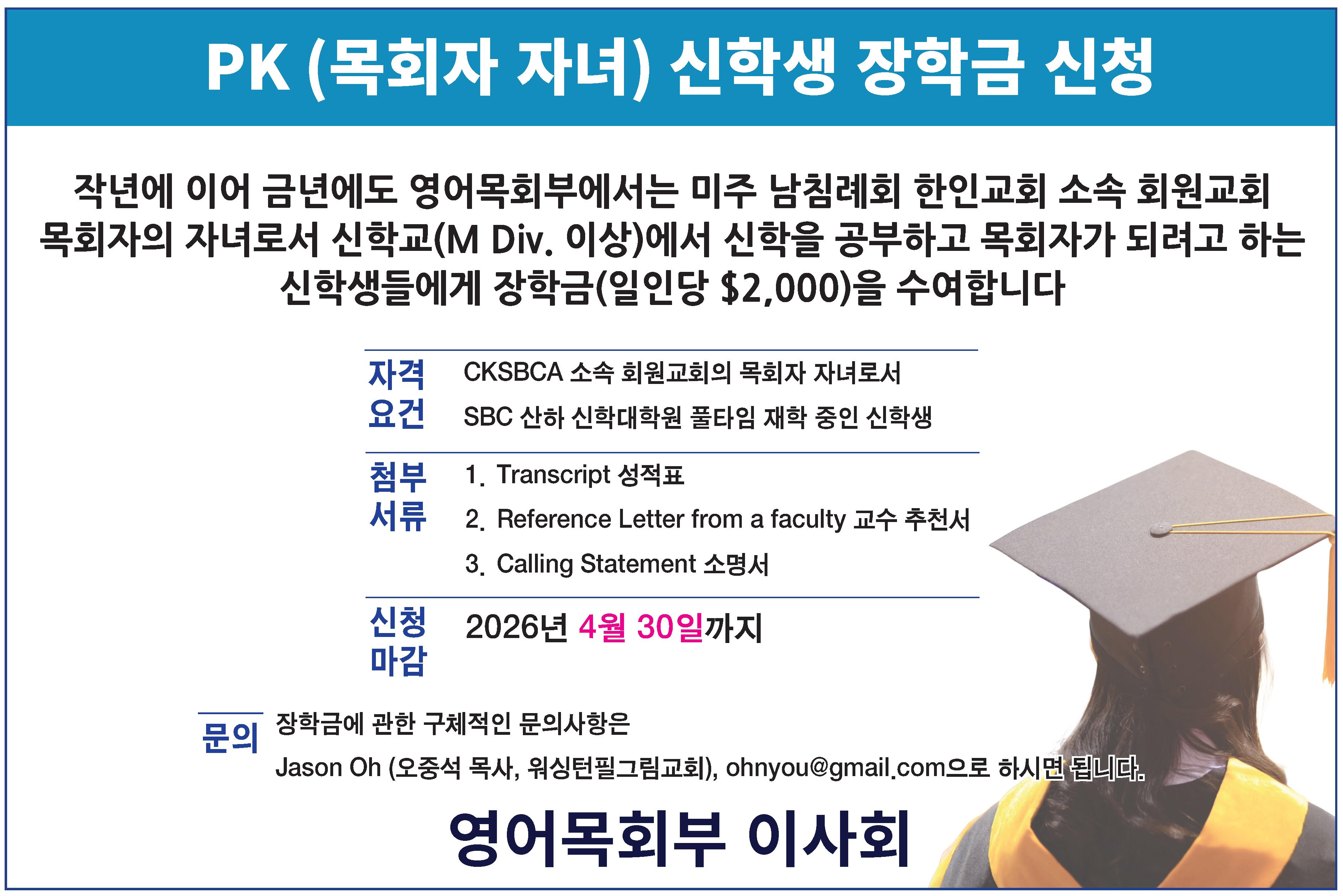 저희 총회 회원교회 목회자 자녀로서, 남침례교(SBC) 산하 신학대학원에 풀타임으로 재학 중인 신학생은 누구나 신청하실 수 있습니다.